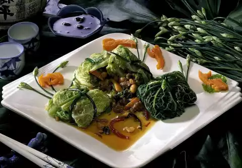 Arrange 3 savoy cabbage packets and some Chinese sauce on plates. Decorate with the remaining chives and cut vegetables. Remaining sauce extra is enough.