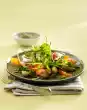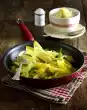 Season with salt and pepper and remove. Heat 1 tablespoon of oil in the frying pan. Add potato noodles and fry for 2-3 minutes until brown, season with salt and pepper and remove. Heat up the frying pan again and fry the pork loin for 2-3 minutes, turning it over.