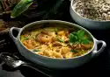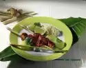 Add the remaining savoy cabbage, fry for another 2-3 minutes, season with salt and pepper. Heat 2 tablespoons of oil in a frying pan. Cut polenta rice into 12 "cake pieces" and fry. Cut small polenta pieces into rhombs, cut them in half horizontally, fry them until crispy, sprinkle with salt and pepper.
