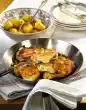 Spread 3 tablespoons of polenta thinly (approx. 5 mm) in one corner of the baking tray. Spread the rest of the polenta in a circle (approx. 1-2 cm thick) on the baking tray and let it cool down. Heat 1 tablespoon of oil in a pan and fry the turkey strips until golden brown all around.