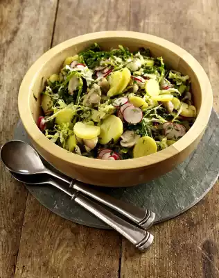Wash potatoes, cook in boiling water for about 20 minutes, drain potatoes, quench, peel and slice. Clean the savoy cabbage, cut in half and cut out the stalk. Wash cabbage and cut into strips. Blanch the cabbage in portions in boiling salted water for 3-4 minutes, remove with a skimmer. Quench in cold water and let it drain