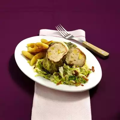 Sauté the vegetables for about 2 minutes, then add 50 ml and cook covered for about 5 minutes until soft. Season the savoy cabbage with salt, pepper and nutmeg. Heat 1 tablespoon of oil in a large pan and fry the potato noodles in it until golden brown all around and season with a little salt. Add ham to the savoy cabbage strips. Remove the roulades from the oven and cut them in half diagonally. Arrange roulades, potato noodles and savoy cabbage