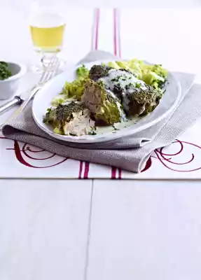 Form the dumpling mixture into 8 oblong dumplings. Place 1 dumpling on each cabbage leaf. Cover the cabbage edges and roll up into roulades. Fix with wooden skewers. Heat oil in a roaster. Brown the roulades in it all around.