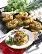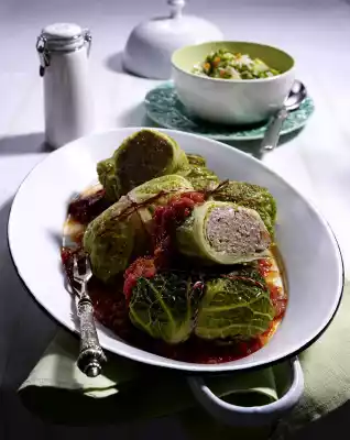 Lay 2 savoy cabbage leaves overlapping on top of each other. Peel and chop the onions. Knead minced onions, egg, half onions, mustard, salt, pepper and carrot rice. Form 6 meatballs and lay them on the cabbage leaves. Turn the pages over, roll them up and tie them up