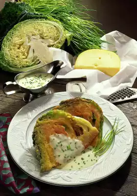 Keep sauce warm. Clean, wash and cut the savoy cabbage into eighths, but do not remove the stalk, otherwise the cracks will fall apart. Blanch the savoy cabbage slices in plenty of boiling salted water for 2 minutes. Remove and let it drip off on kitchen paper. Put the flour and breadcrumbs on a flat plate. Whisk the eggs in a flat bowl. Turn cabbage slices in flour, egg and breadcrumbs. Heat oil in a frying pan. Fry the slices on both sides in the pan until golden brown. Wash the chives, dab dry, put something aside for garnishing. Cut the rest of the chives into small rolls. Arrange two savoy cabbage slices on each plate with cheese sauce.