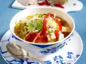 Wash the potatoes and cut into evenly sized slices. Wash savoy cabbage and cut into fine strips. Wash mushrooms, drain and cut into thin slices