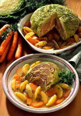 Put the cabbage in so that it is covered. Cover and let it simmer at low heat for about 1 hour. Peel and wash the potatoes and carrots. Quarter potatoes lengthwise and cut carrots into diagonal slices. Add potatoes and carrots to the stock about 25 minutes before the end of the cooking time. Wash the herbs. Put something aside for garnishing. Chop the rest. Take cabbage out of the water and let it drip off a little. Remove cloth and arrange savoy cabbage in a large, flat bowl. Remove the boullion potatoes from the pot with a skimmer. Place around the cabbage and cover with stock. Sprinkle with the herbs. Combine the remaining herbs as bouquets and garnish with them