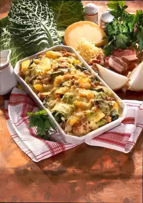 Briefly fry the potatoes, savoy cabbage and onions in the frying fat. Sprinkle with flour and sweat. Stir in 1/2 l water. Bring to the boil, stir in the stock, cover and braise over medium heat for 10-15 minutes