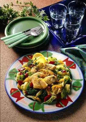 Mix 4 tablespoons of lemon juice with salt and pepper, add oil and thyme leaves. Mix the salad ingredients with the marinade and arrange on a plate. Wash the fish and dab dry.