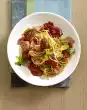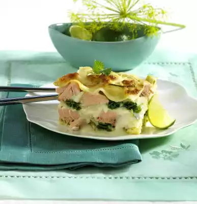 Grease an ovenproof dish (approx. 20 x 30 cm). Spread a little béchamel sauce thinly on the bottom of the dish and place 3 lasagne plates on top. Spread half of the savoy cabbage on top, place half of the salmon cubes on top and cover with béchamel sauce.