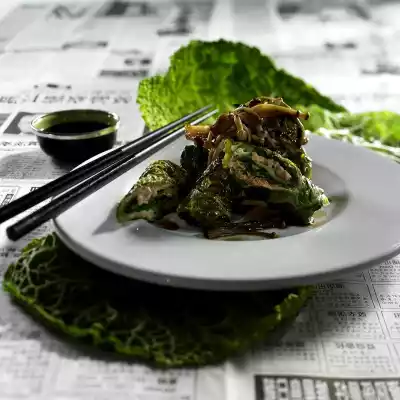 Clean and wash the savoy cabbage and remove 16 large leaves (use the rest of the cabbage elsewhere). Blanch in plenty of boiling salted water for about 3 minutes, drain. Cut the midribs flat.