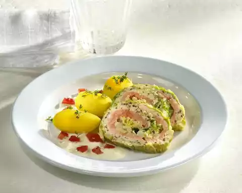 Cleaning the savoy cabbage. Loosen 8 large leaves and remove the stalk. Finely chop the remaining savoy cabbage. Blanch the leaves and chopped savoy cabbage one after the other in bubbling salt water for about 4 minutes, rinse in cold water and drain on a sieve. Peel and wash the potatoes and cook in boiling salted water for about 20 minutes. Mix mustard, 2 tablespoons crème fraîche and breadcrumbs.