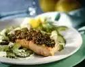 Rinse salmon, dab dry and cut into slices of about 1 cm thickness. Spread a clean tea towel on the work surface. Spread the savoy cabbage leaves in flakes. Spread a thin layer of mustard paste over it. Place salmon slices on top, sprinkle with lemon juice and season with salt. Spread the chopped savoy cabbage on top. Form everything into a roll, wrap it in the tea towel, tie the two ends together. Leave to stand in a pot covered with salted water at medium heat for about 10 minutes. Peel and chop the onions. Heat the oil in a pot. Sauté onions in it, deglaze with white wine, stir in 200 g crème fraîche and bring to the boil. Season to taste with salt and pepper.