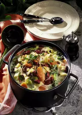 Bring the stock to the boil. Clean, wash and cut the savoy cabbage into bite-sized pieces. Peel and wash the carrots and cut them into diagonal slices. Add both to the stock, cover and cook over a low heat for ten minutes.