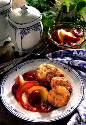 Cut the apple quarters into slices. Boil up the plums and apples with 100 millilitres of water, two tablespoons of sugar and vanillin sugar. Let simmer for ten minutes (fruits from the jar with the juice only bring to the boil).