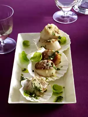 Wash the chives, shake dry, cut into fine rings. Peel shallots and dice very finely. Open scallops (fresh scallops should be heavy and closed). To open, place the flat shell on top and cut along the inside of the upper shell with a knife, then fold up the flatter shell. Remove the mussel flesh, remove all black offal and the beard. Depending on your taste you can also use the orange-red roe (Corail). Keep 6 lower mussel shells
