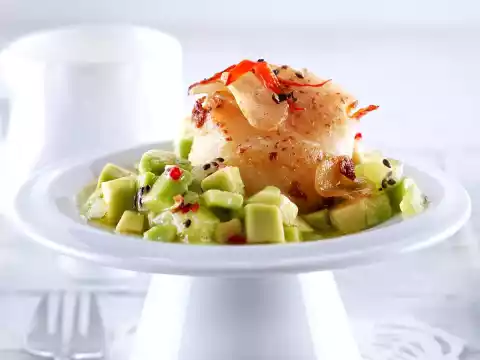 Cut the avocado in half lengthwise and remove the stone. Remove the flesh from the skin and dice finely. Mix chili cubes, shallot, kiwi, avocado and lime juice. Season to taste with salt and pepper.