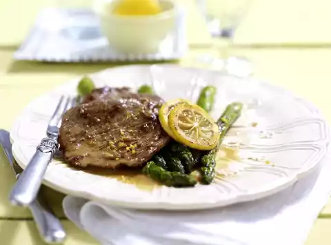 Dab veal escalope dry, cut in half, beat flat between 2 layers of foil, place in a flat dish or bowl. Pour the lemon-oil mixture over it, cover and marinate in the refrigerator for about 1 hour, turning 1x in between. Wash asparagus, dab dry, cut off woody ends