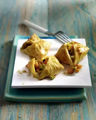 Season with salt, pepper and paprika. Place the puff pastry slices on top of each other and roll out rectangularly (approx. 33 x 44 cm) on a floured work surface and cut into 12 squares. Spread the scampi mixture in the middle of each square and brush the edges with some water. Fold the dough corners towards the middle, then press the edges together to form a packet. Place the scampi packet on a baking tray lined with baking paper and prick the dough several times with a wooden skewer. Bake in a preheated oven (electric cooker: 200 °C/ convection oven: 175 °C/ gas: level 3) for 20-30 minutes until golden brown. Remove the parcels from the oven and serve