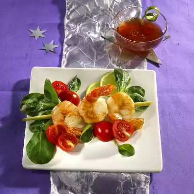 Wash the scampi, dab dry and put 3 scampi on each lemongrass skewer. Sprinkle the scampi with 1 tablespoon lime juice and season with salt and pepper. Heat 1 tablespoon of oil in a pan. Fry the scampi skewers for about 2 minutes on each side. Arrange salad, tomatoes and scampi skewers on plates. Drizzle with vinaigrette and garnish with slices of lime