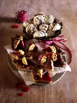 Spread the jam evenly on the dough and refrigerate for about 2 hours. Coarsely chop 150 g chocolate coating. Melt the couverture and coconut oil in a bowl over a warm water bath. Cut the slices into about 36 lozenges. Pour the couverture into a small freezer bag or piping bag and cut off a small corner. Decorate the lozenges half with chocolate coating and 1/4 walnut each, then put them in a cool place for about 1 hour (until the chocolate is firm)