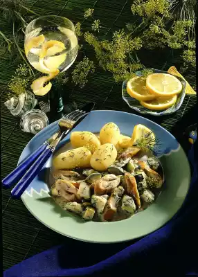 Stir in the sauce thickener and bring to the boil and simmer on a low heat for five minutes. Cut the curled strips into two centimetre thick slices, add 3/4 of the dill and the curled strips to the sauce, season with salt and pepper and keep warm. Drain and peel the potatoes. Arrange the zucchini schillerlocken vegetables with boiled potatoes and garnish with the remaining dill and possibly with dill flowers.