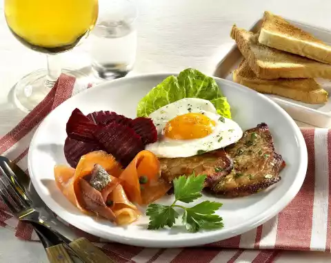 Arrange escalope, fried egg, salmon, anchovies, capers, lettuce leaf and beetroot on plates. Sprinkle with coarsely ground pepper and chopped parsley. Garnish with parsley leaves. Serve with toast bread.