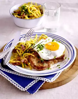 Wash the chives, shake dry and, except for a few stalks for garnishing, cut into fine rolls. Arrange schnitzels and fried eggs with some spaetzle on plates. Sprinkle with chives and garnish.