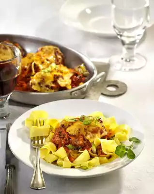 If necessary, briefly rinse and pat dry the cutlets. Season with salt and pepper and place in a large greased casserole dish. Season mince with salt and pepper. Spread over the escalopes and press lightly. Pour tomato sauce over them. Braise in the preheated oven (electric cooker: 175 °C/recirculating air: 150 °C/ gas: stage 2) for 1 3/4 - 2 hours
