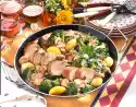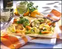 Grate the cheese and sprinkle over the escalopes 15-20 minutes before the end of the frying time. Clean and wash spring onions and cut them into fine rings. Arrange everything, sprinkle with spring onions and garnish. Ribbon noodles taste good with it