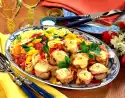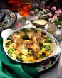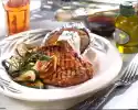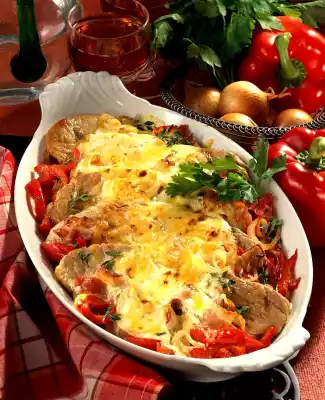Season with salt, pepper and thyme. Put the paprika vegetables in an ovenproof dish. Put cutlets and bacon on top. Season crème fraîche with salt and pepper and pour over the escalopes. Sprinkle with remaining onions and cheese. Bake in the preheated oven (electric cooker: 225 ° C/ gas: level 4) for 10-15 minutes. Garnish with parsley
