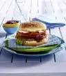 Spread the bottom of the burger bun with 1/4 of the sauce. Cover with 1/4 of the lettuce, tomatoes, escalopes and cucumber slices. Place the top of the bun on top. Cover remaining rolls in the same way