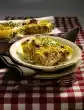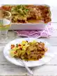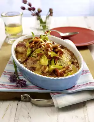 Pour everything over the escalopes, sprinkle evenly with cheese. Close the mould with aluminium foil and braise in a hot oven for about 1 1/2 hours. After 1 hour remove the foil and braise open to the end.