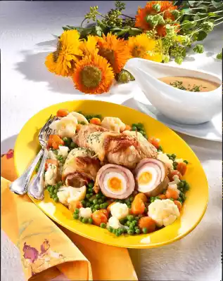 Season with salt and pepper. Deglaze with 1/4 litre water and bring to the boil. Braise under closed lid for 12-15 minutes at low heat. Meanwhile clean and wash the cauliflower and divide into florets. Heat the fat in a pot and sauté the cauliflower in it. Deglaze with broth, bring to the boil and cook for 15-20 minutes on low heat. 10 minutes before the end of the cooking time add carrots and peas and cook. Season with salt and pepper. Remove roulades from the pan and keep warm. Pour roast stock through a sieve and top up with cream. Bring to the boil and thicken with sauce thickener. Season to taste with salt and pepper.