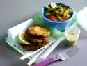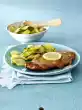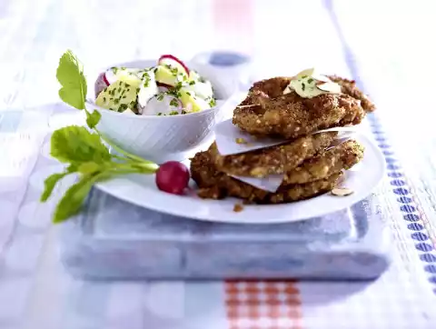 Mix 75 g crème fraîche with the potato salad. Arrange the potato salad in a bowl and cutlets on a plate garnished with radishes