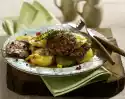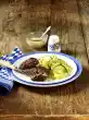 In the meantime, whisk eggs in a deep dish. Mix flour with salt and pepper. Wash the meat, dab dry and cut in half. Heat 20 g clarified butter in 2 pans, fry the meat for 1-2 minutes on each side.
