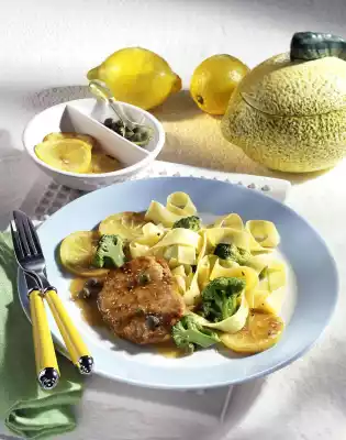 Deglaze the meat with 100 ml water and lemon juice, bring to the boil. Bind with sauce thickener. Add capers. Season to taste with salt, pepper and sugar. Drain pasta and broccoli. Serve with schnitzel and lemon sauce