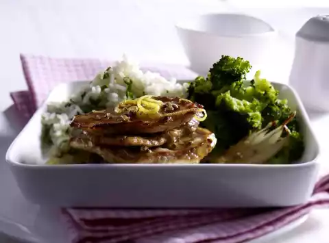 Drain the broccoli, catching the broth. Take out the cutlets. Sauté shallot in frying fat. Deglaze with 5 tbsp. stock and 1-2 tbsp. lemon juice, bring to the boil. Season to taste with salt and coarse pepper.