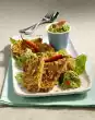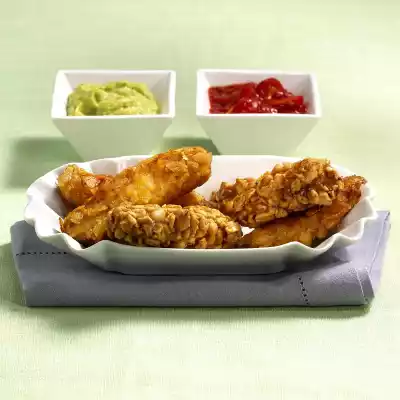 Put the flour, chips and peanuts in a deep plate. Turn the schnitzel strips first in flour, then in egg and alternately in peanuts and chips. Cut avocado in half, remove stone. Peel the flesh from the skin, cut a little smaller.