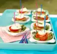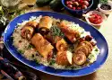 Add lemon juice, cumin and salt and puree. Wash and quarter the tomatoes. Peel and finely dice the shallot. Grate cheese finely. Mix tomatoes, shallot, parmesan and aiwar. Heat oil in a pan and fry escalope strips all around for about 5 minutes.
