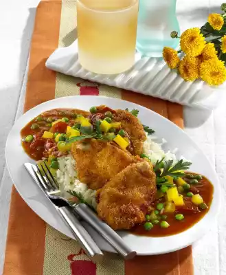 Put rice in boiling salted water. Leave to soak for about 20 minutes. In the meantime, wash the cutlets, dab them dry and cut them into portions. Whisk eggs. Season breadcrumbs with salt, pepper and paprika.