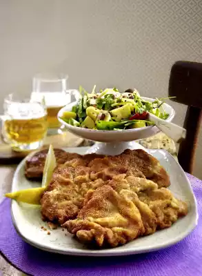 Arrange the escalopes on a plate, garnished as desired with lemon wedges or slices. Serve the potato salad garnished with chilli pepper in a bowl with it