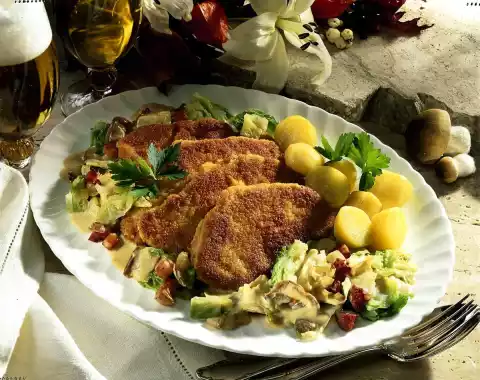 Pour the cream into the savoy cabbage, add the sauce thickener while stirring and let it boil for about 1 minute. Arrange creamed savoy cabbage, potatoes and schnitzel on a plate. Serve garnished with parsley.