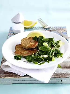 Fry the meat for about 3 minutes on each side. Heat 1 tsp. oil in a pot. Add garlic, 2 tbsp. water, 1 tbsp. lemon juice and lemon peel. Fry the spinach and spring onions for 2-3 minutes, turning until the spinach has completely collapsed.