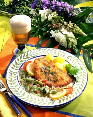 Garnish the schnitzel and vegetables with lemon and tomato slices and parsley. Boiled potatoes taste good with it.