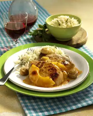 Wash the schnitzel and dab dry. Cut in half, season with salt and pepper and place in an ovenproof dish. Drain pineapple and mushrooms. Halve the pineapple slices. Spread mushrooms and pineapple on the cutlets.