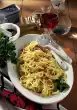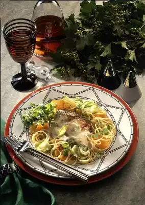 Take out the meat. Stir the cheese, chopped marjoram and cream into the frying stock. Thicken with sauce thickener, season to taste. Add meat to the sauce. Drain noodles. Serve drained with meat and sauce.