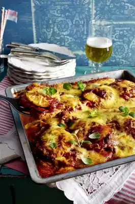 Cover each cutlet with a slice of ham and a slice of pineapple. Spread the sauce evenly on top. Cover with foil and press firmly around the tray. In a preheated oven (electric cooker: 175 °C/ convection oven: 150 °C/ gas: see