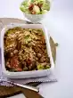 Wash the meat, dab dry and rub with salt and pepper. Spread the fat in flakes on the meat and place in a roasting pan. Roast in a preheated oven (electric cooker: 175 °C / gas: level 2) for approx. 2 hours. Peel onions, cut in half and add 200 ml broth after approx. 30 minutes for frying. Meanwhile cook the noodles in plenty of boiling salted water for about 12 minutes.