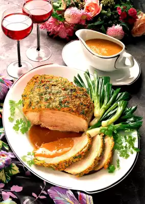 Mix mustard, egg, breadcrumbs and chervil. Spread on the roast for the last 1/4 hour. For the vegetables, clean and wash the spring onions. Blanch in broth for about 5 minutes, drain.